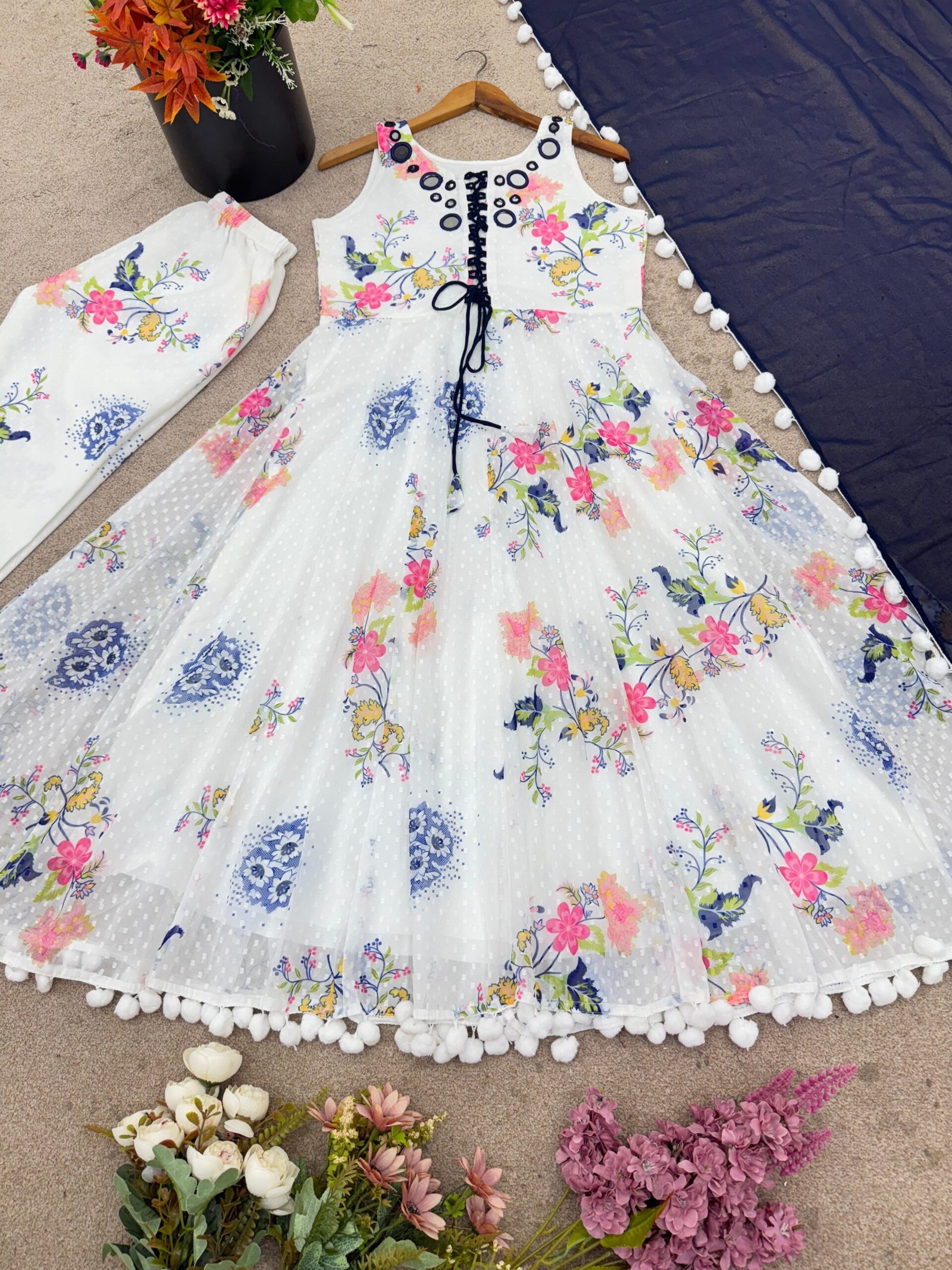 * Fabric: Heavy 1000 Butti Georgette With Digital Print And Mirror Work With Pom Pom Lace Border With Fully Flair