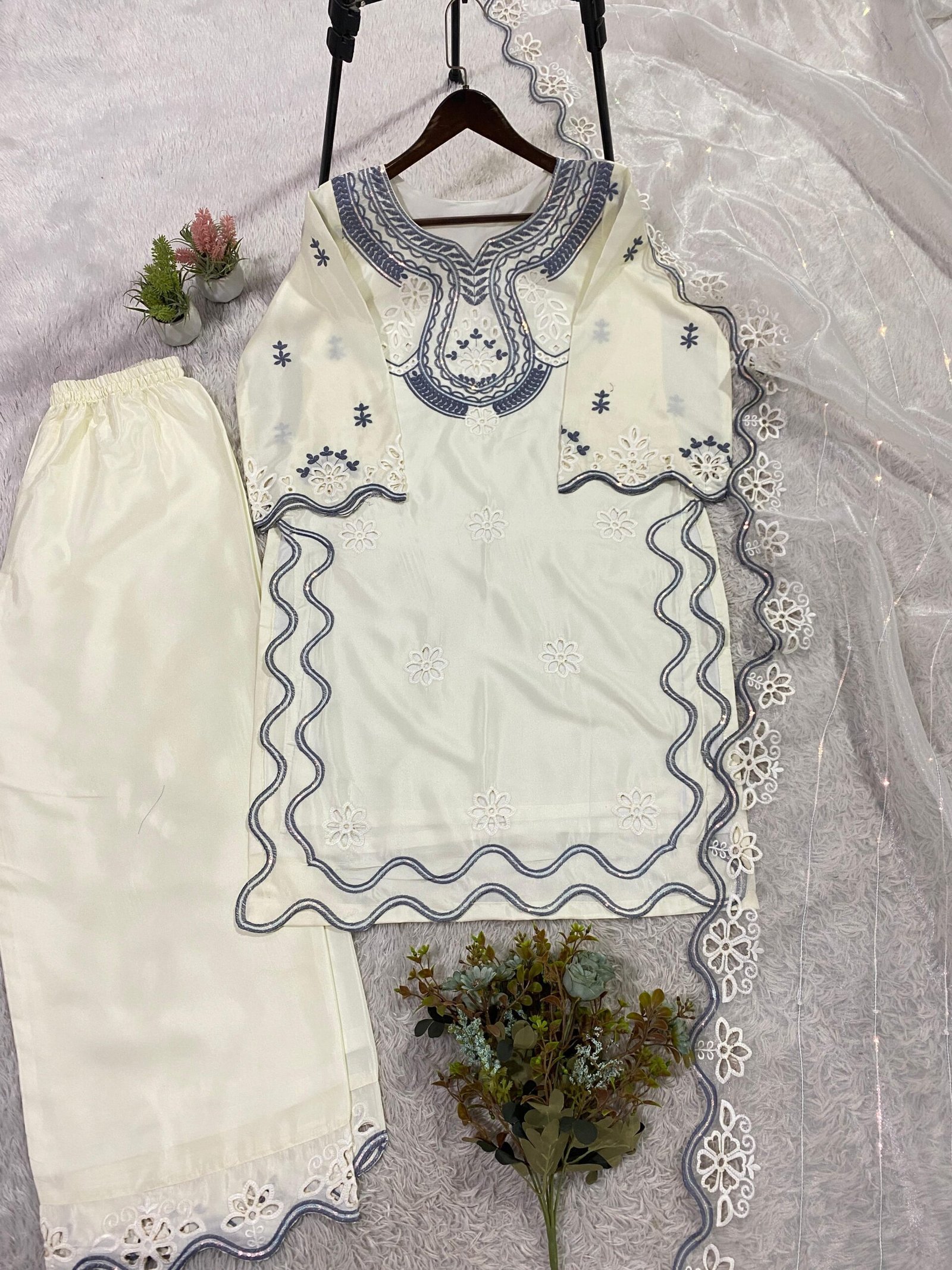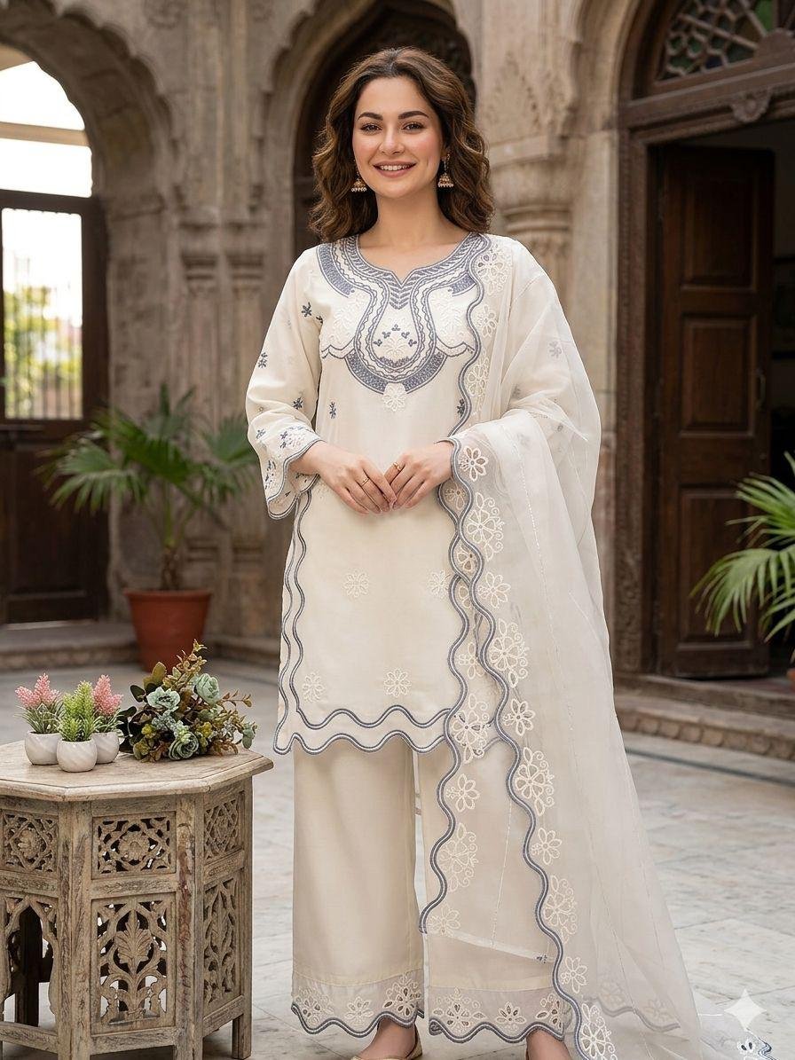 HANIA AMIR INSPIRED THIS SUMMER SEASON WEAR PAKISTANI SUIT WITH SEQUENCE EMBROIDERED CUT WORKED TOP, PLAZZO AND DUPATTA