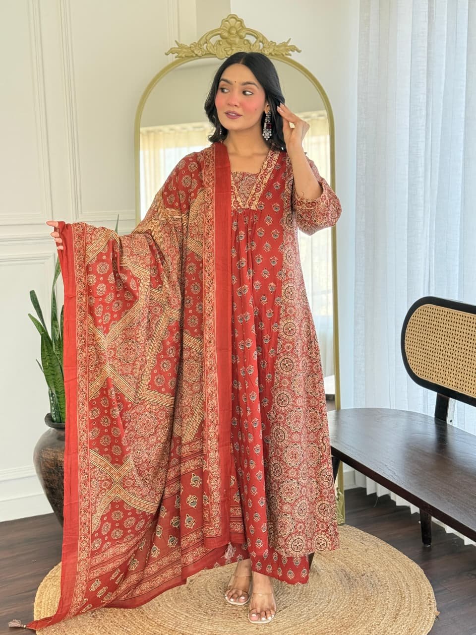 Details -: printed cotton anarkali kurti with plazzo and mulmul duptta…
