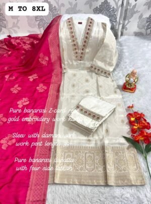 SKU: Look straight out of a dreamy movie set as you turn around and walk in this elegant SImmer jaquard silk (attached fully silk inner) hand premium work suit.. the perfect blend of traditional wear and chic design.