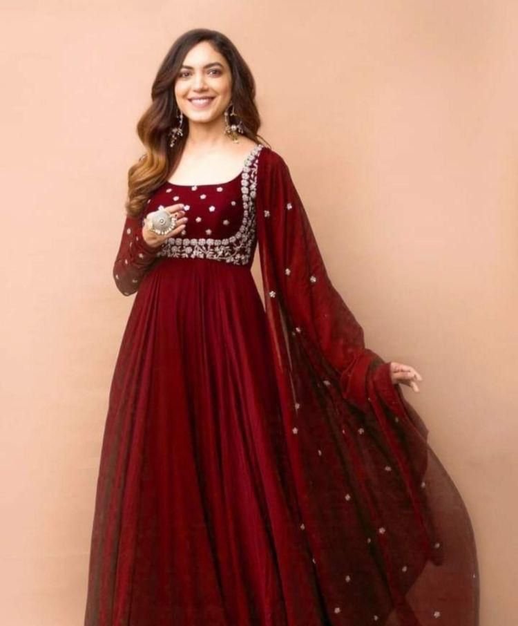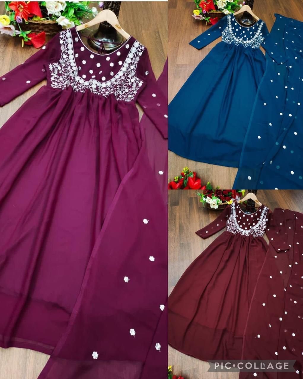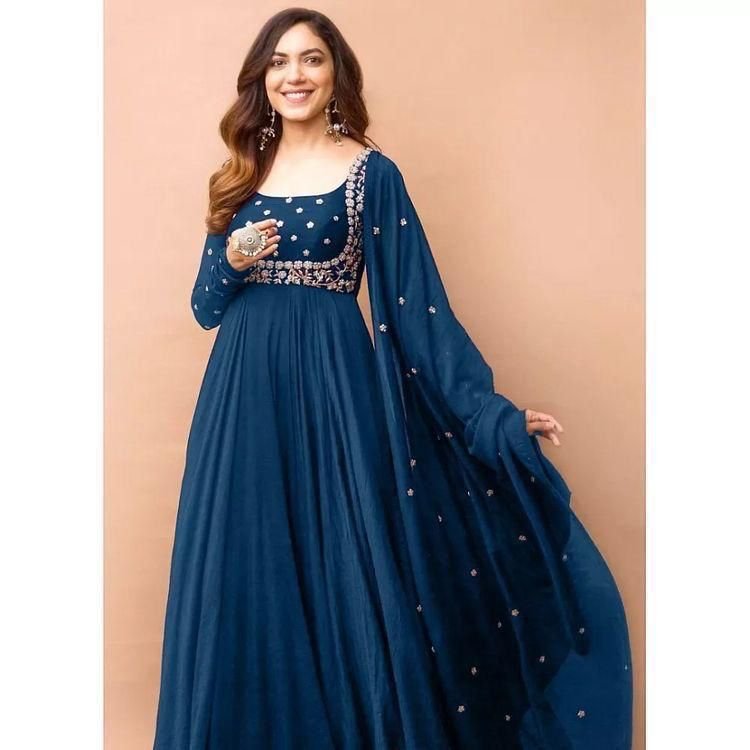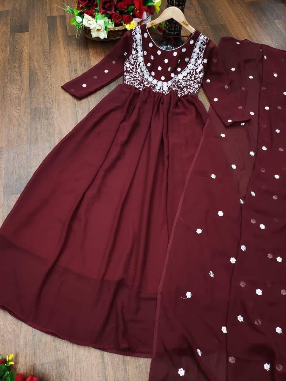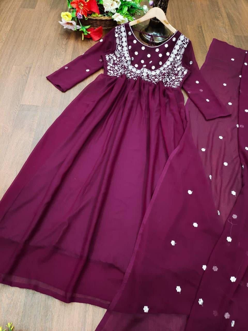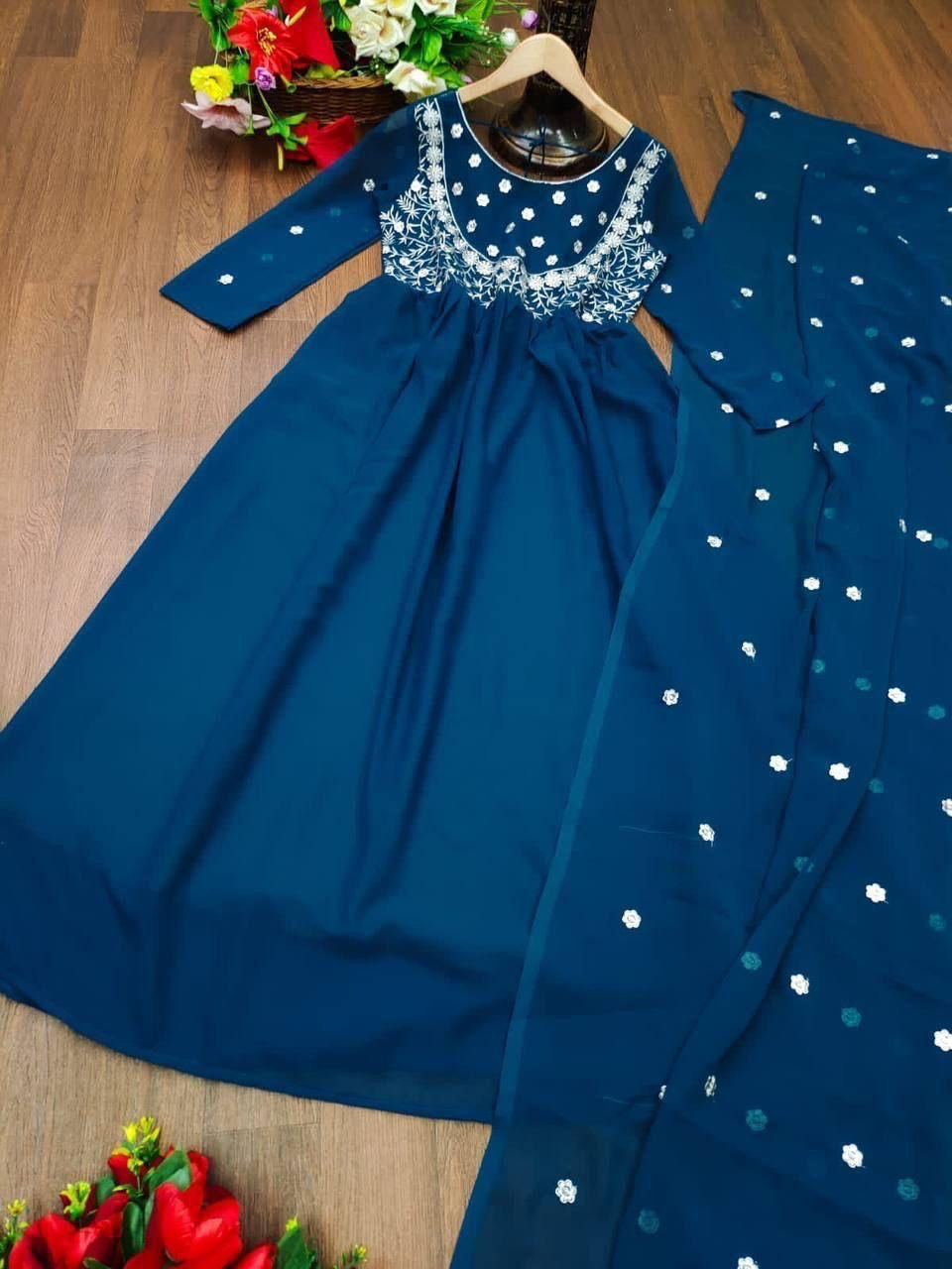 We would love to go Georgette all the time like you! Two Colour Georgette Anrkali dress is uniquely Embriodry designed with full sleeves And Full Cut Dupatta . It is giving perfect stylish look for this season.
