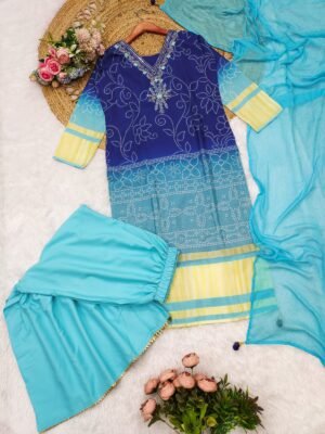 collection of elegant three-piece suit sets, each comprising a kurti, matching bottoms, and a dupatta A prominent feature of these sets is the gradient or ombré effect on the kurtis, combined with traditional bandhani-style dot patterns created through digital printing. The necklines are embellished, adding a touch of sophistication.