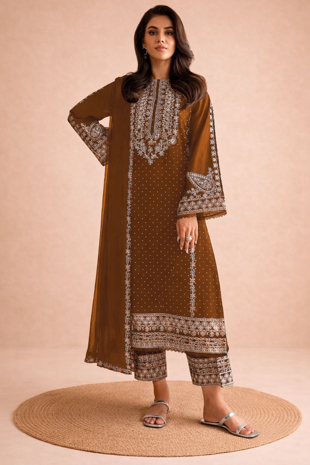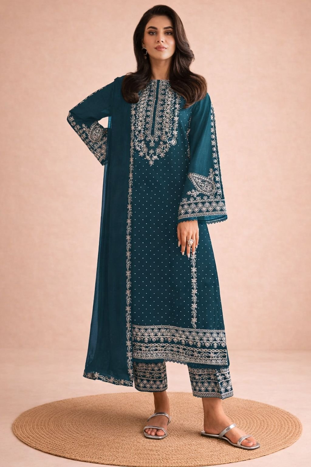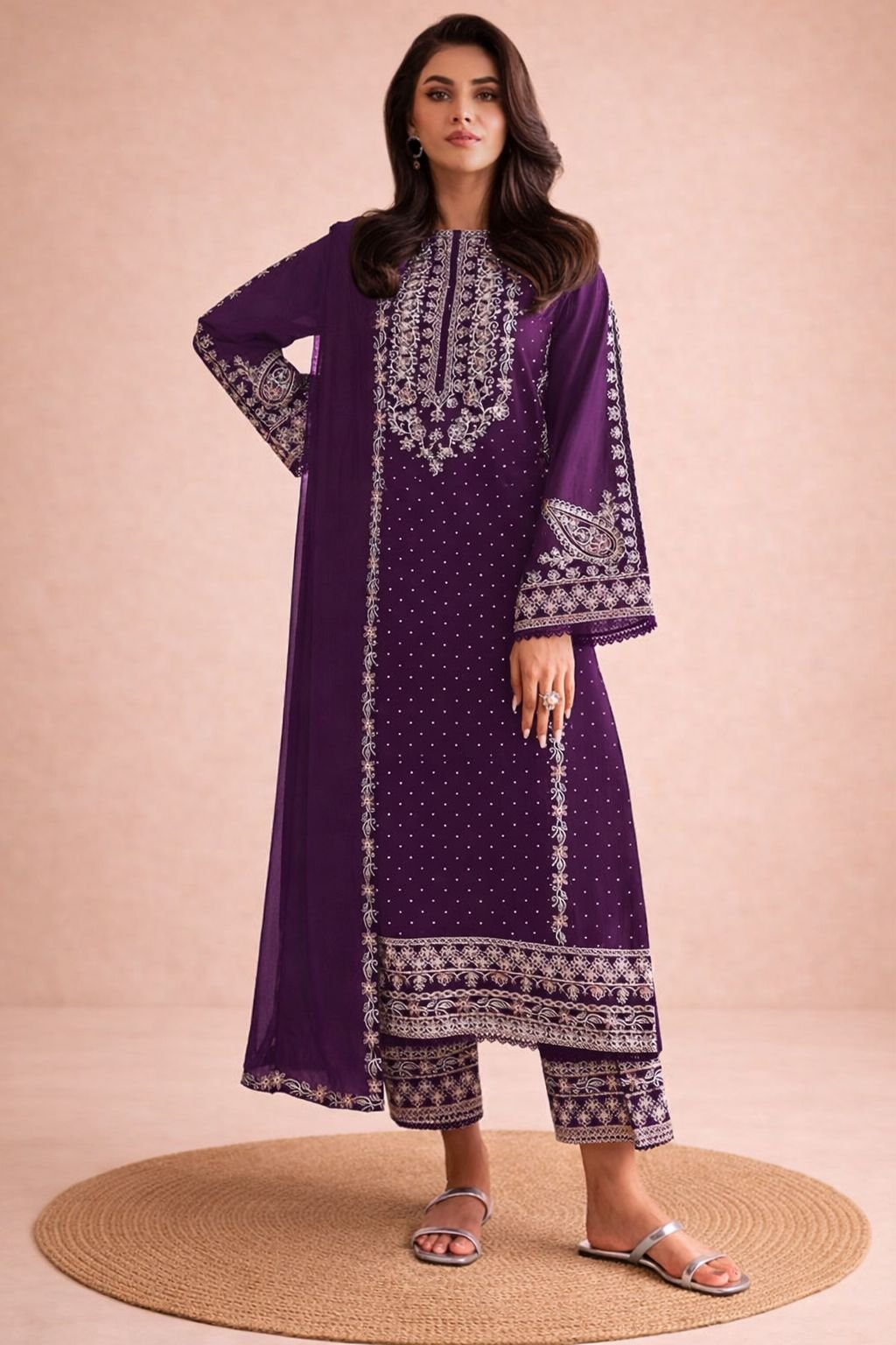 This elegant ensemble is designed with rich multi-thread embroidery and subtle stone detailing that adds festive sparkle and refined charm. The beautifully finished daman and coordinated embroidered sleeves create a graceful, boutique-style look perfect for special occasions.