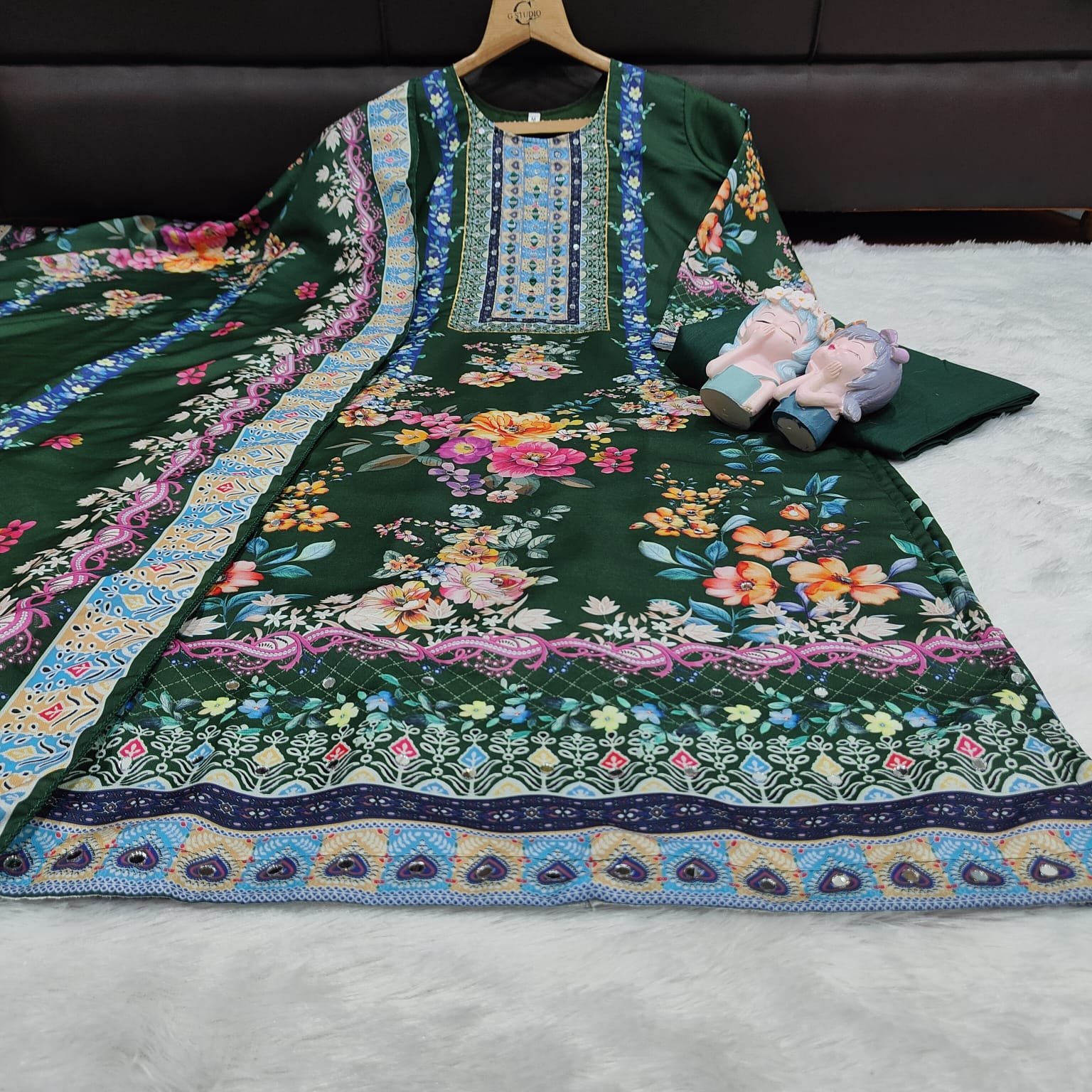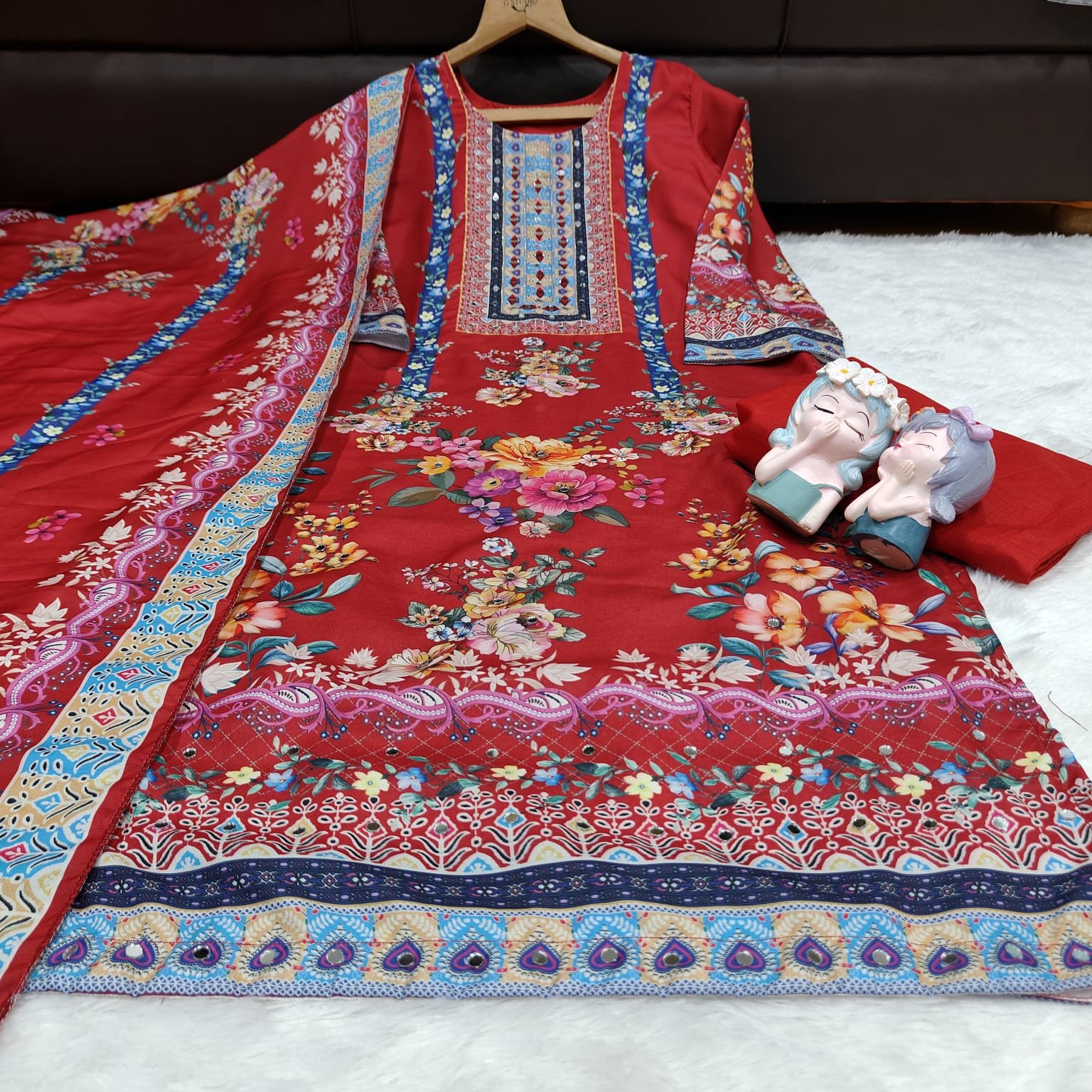 Enhance your ethnic wardrobe with this exquisite 3-piece Muslin suit set. Known for its lightweight feel and luxurious sheen, this outfit is designed to provide both comfort and a high-fashion appeal. The soft peach/cream base is beautifully complemented by vibrant floral prints and intricate traditional detailing*