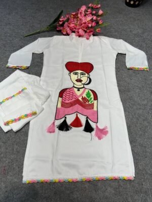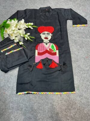 AK-G29″ Black & White Color Anarkali Suit Set seems to be a party wear outfit made from Maslin fabric with Fancy multicolor Lace Border with Embroidery Chain Works(2-Pair)