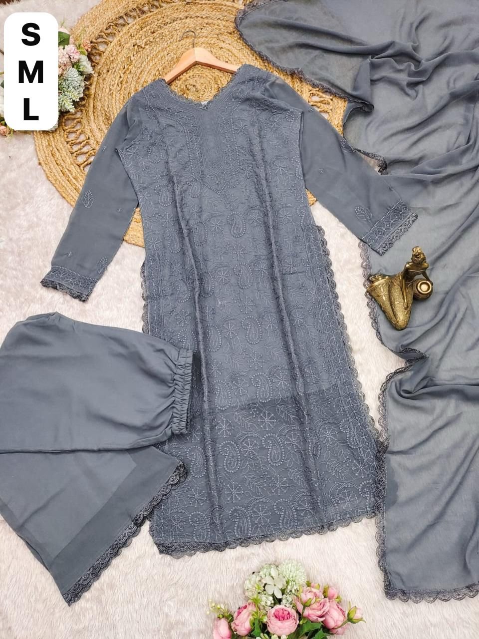 Featuring soothing yet fox georgette Febric with chikankari embroidery work and full lining with Grorgett dupatta embroidery work with lace elegant work gown with Color.Long suit with side cut style and pettern. It is a perfect outfit for any small gathering or function. It is very comfortable as it looks