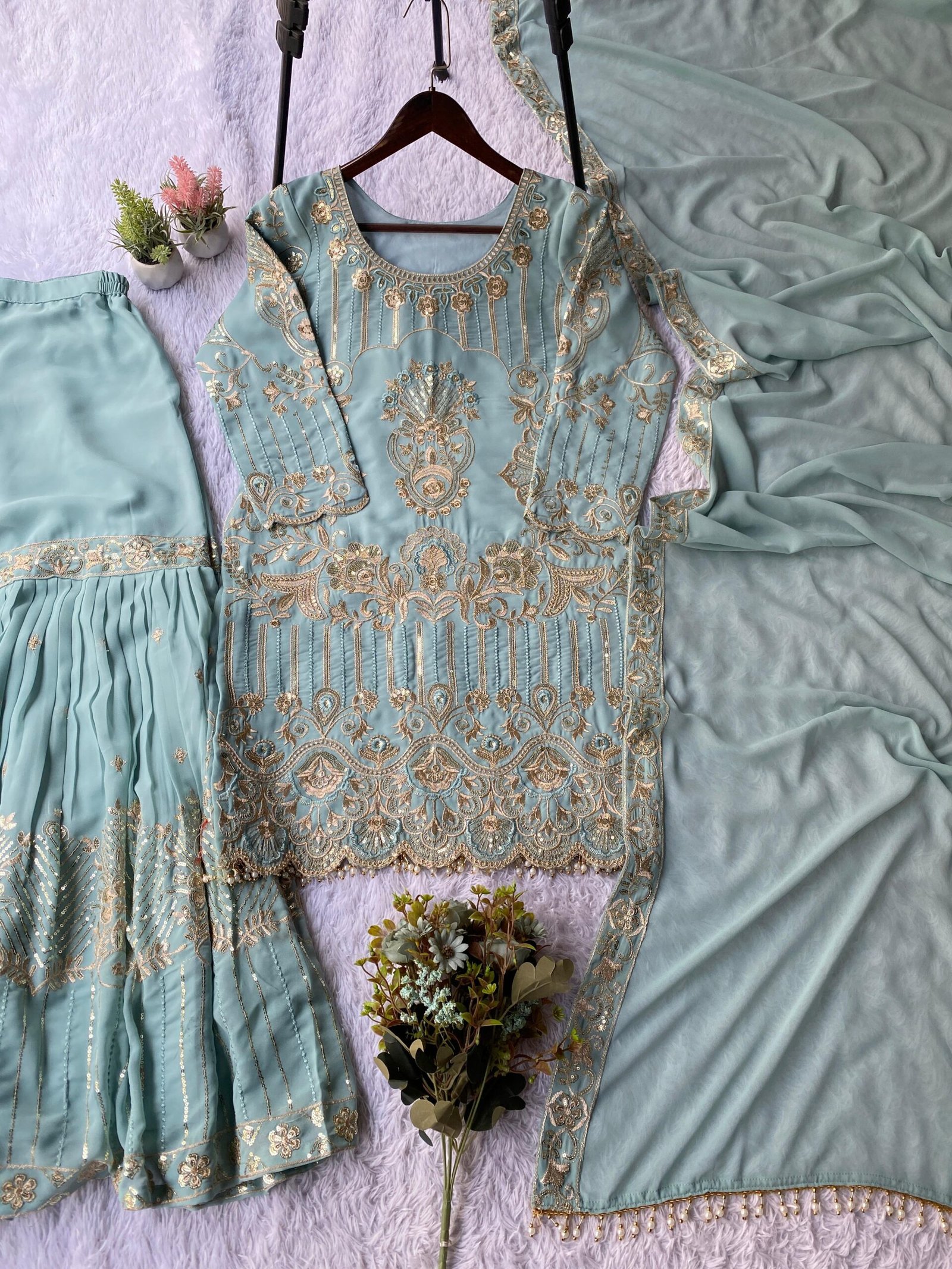 FOR THIS EID OUR SEQUENCE EMBROIDERY WORKED TOP, SARARA AND DUPATTA