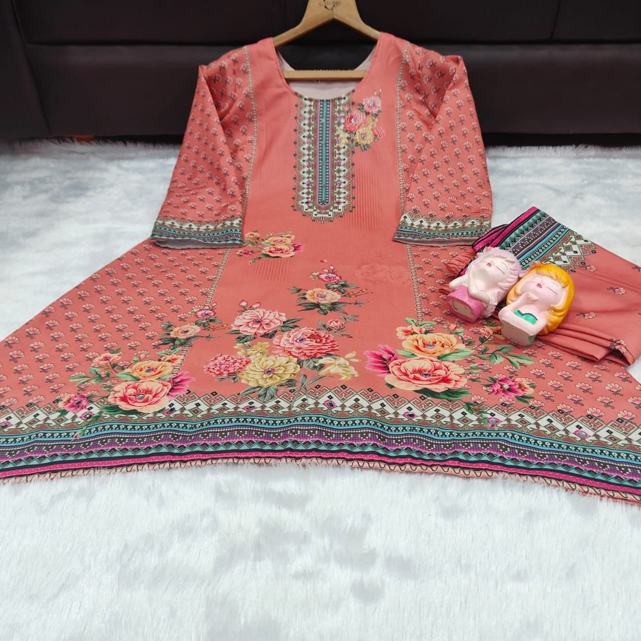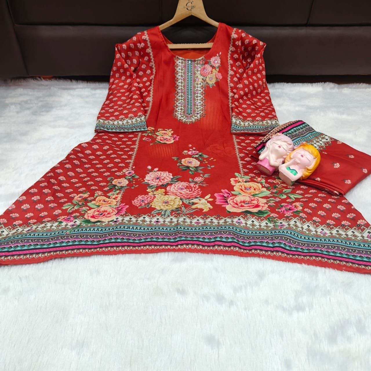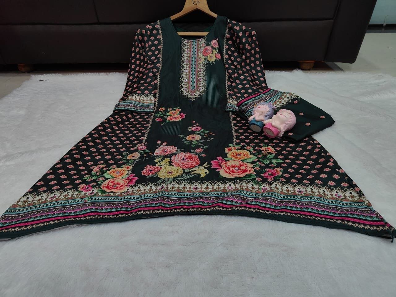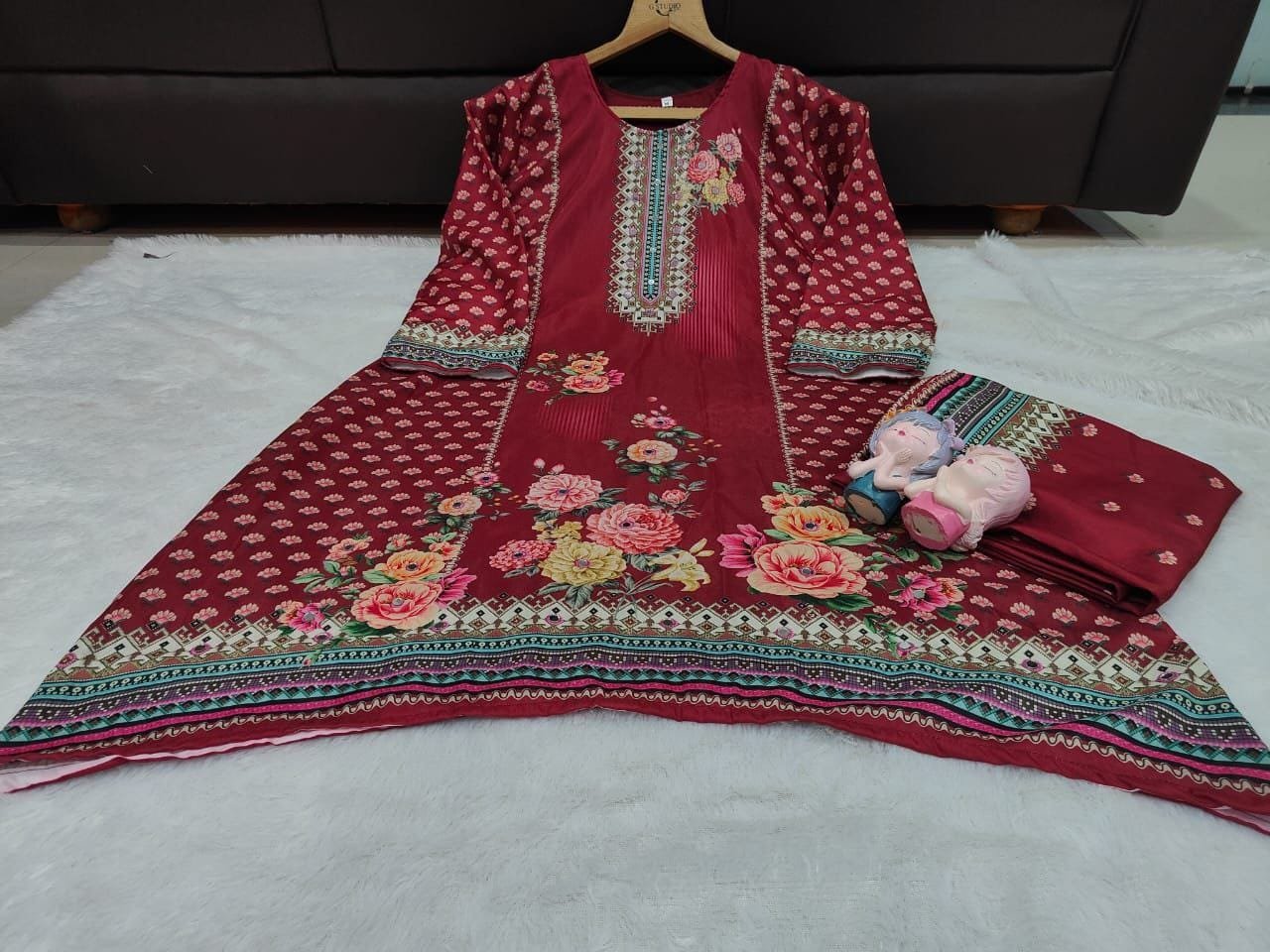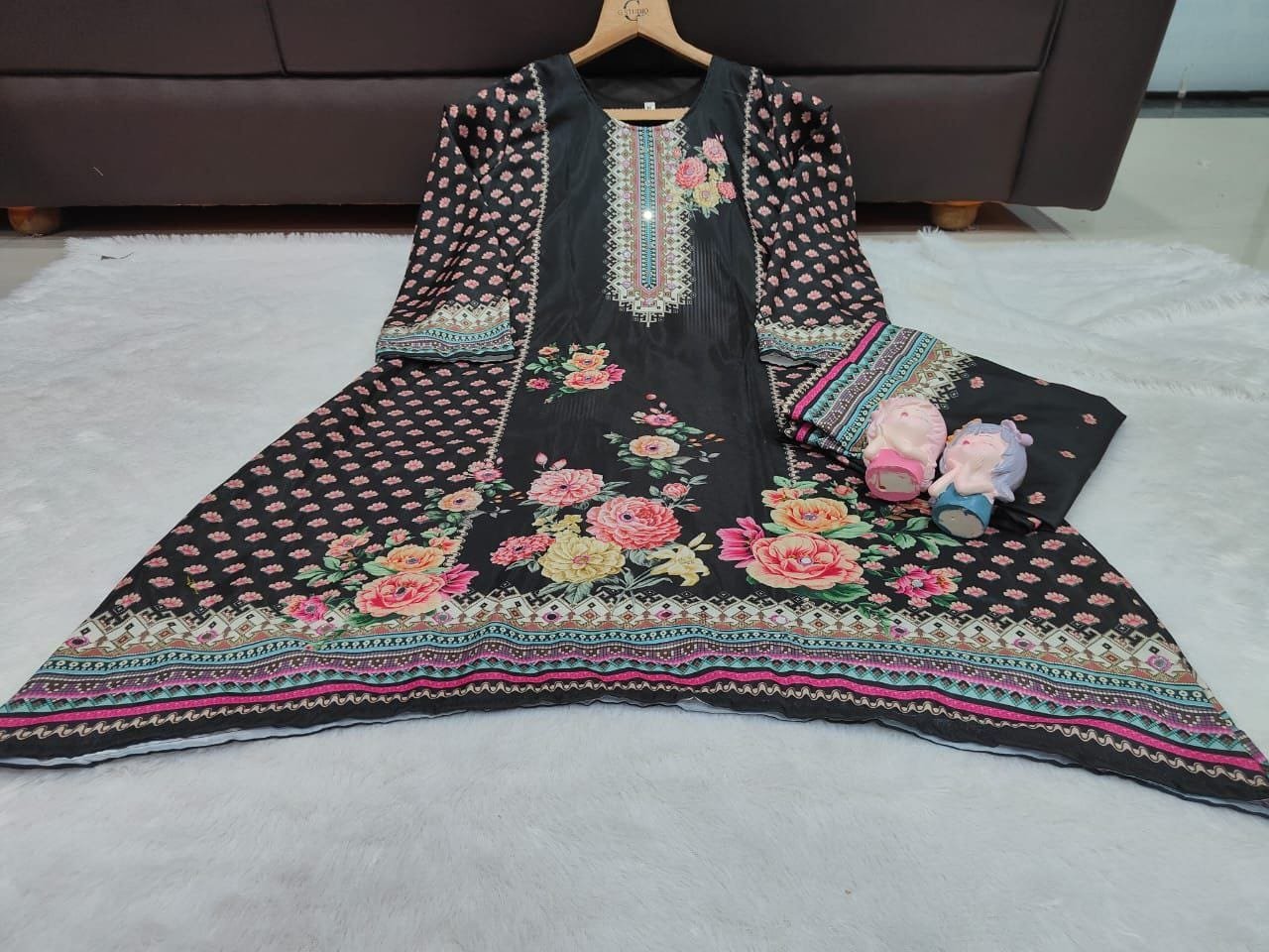 This design is based on soft maslin and crafted with finest Hand mirror work on Digital Print.