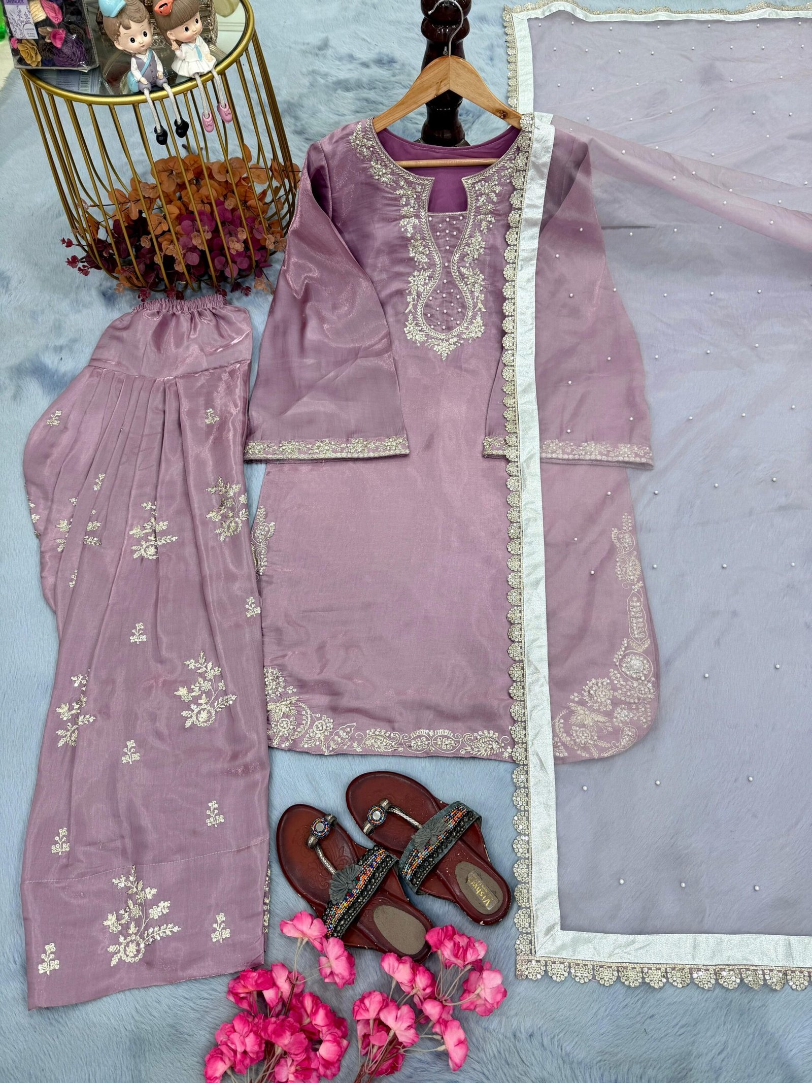 Be the first to review “stitched Launching New Đěsigner Party Wear Look Pur Glass Satin Top & Farshi Palazzo With Dupatta set” Cancel reply