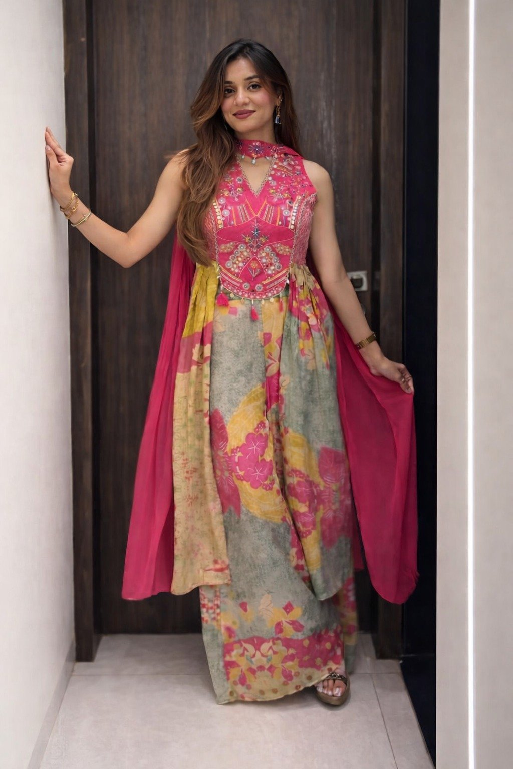 Step into timeless elegance with this exquisite Wedding kurti set, designed to make you stand out at any festive or celebratory occasion. Crafted from luxurious Chinon, the Wedding features a graceful flare that flows beautifully, creating a regal and sophisticated look silhouette. The intricate detailing on the yoke adds a touch of traditional charm, while the soft fabric ensures all-day comfort.