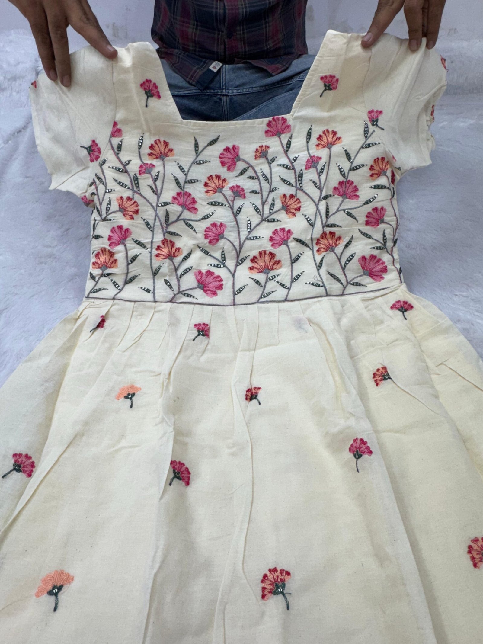 Beautiful Mul cotton fabric stitched embroidery designer gown with micro cotton inner & patterned sleeves.