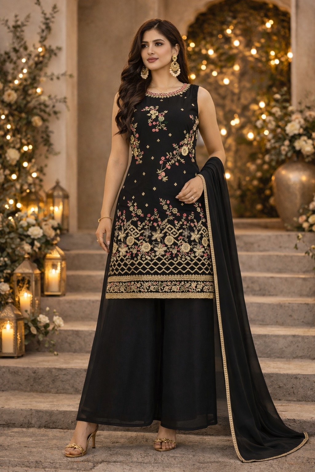 SKU: Today We are Launching Exclusively Festive & Party Wear Heavy Fox Georgette With With Embroidery Sequence Work Top -Palazzo And Dupatta Set Fully Stitched Ready To Wear