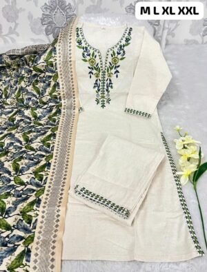 Our beautiful silk dupatta with all over kurta embroidered nd beautiful sleves embroidery workwork cotton kurta paired with standard same bottom fabric paired with beautiful art silk dupatta..
