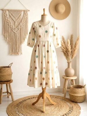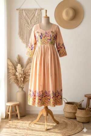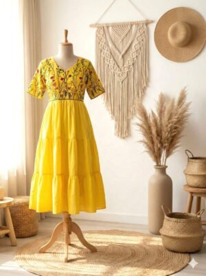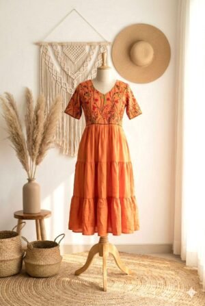 Crafted with meticulous attention to detail, this dress boasts delicate embroidery that adds a touch of artisanal charm. The colour combination complements each other and Three three-tire flare adds the extra Flowiness
