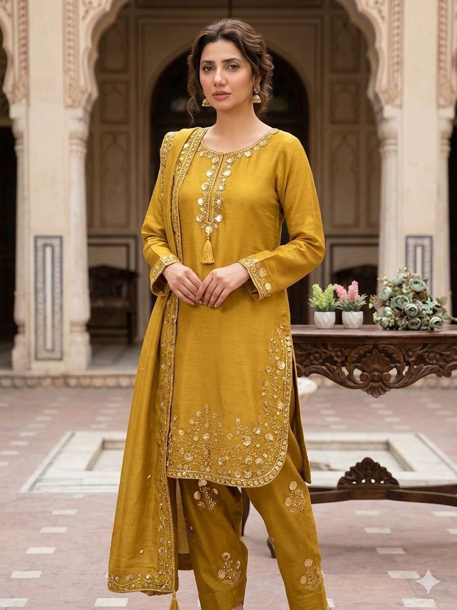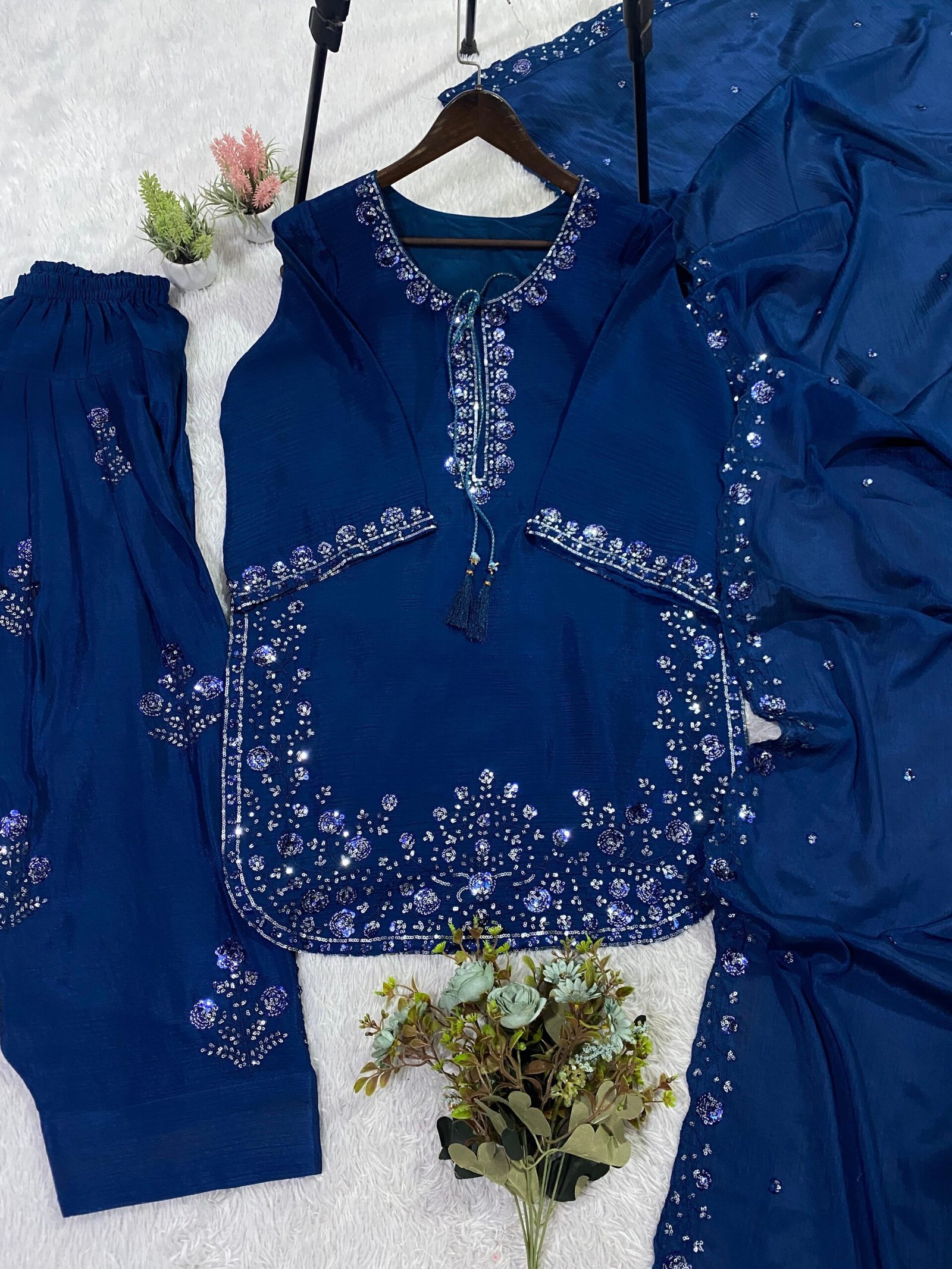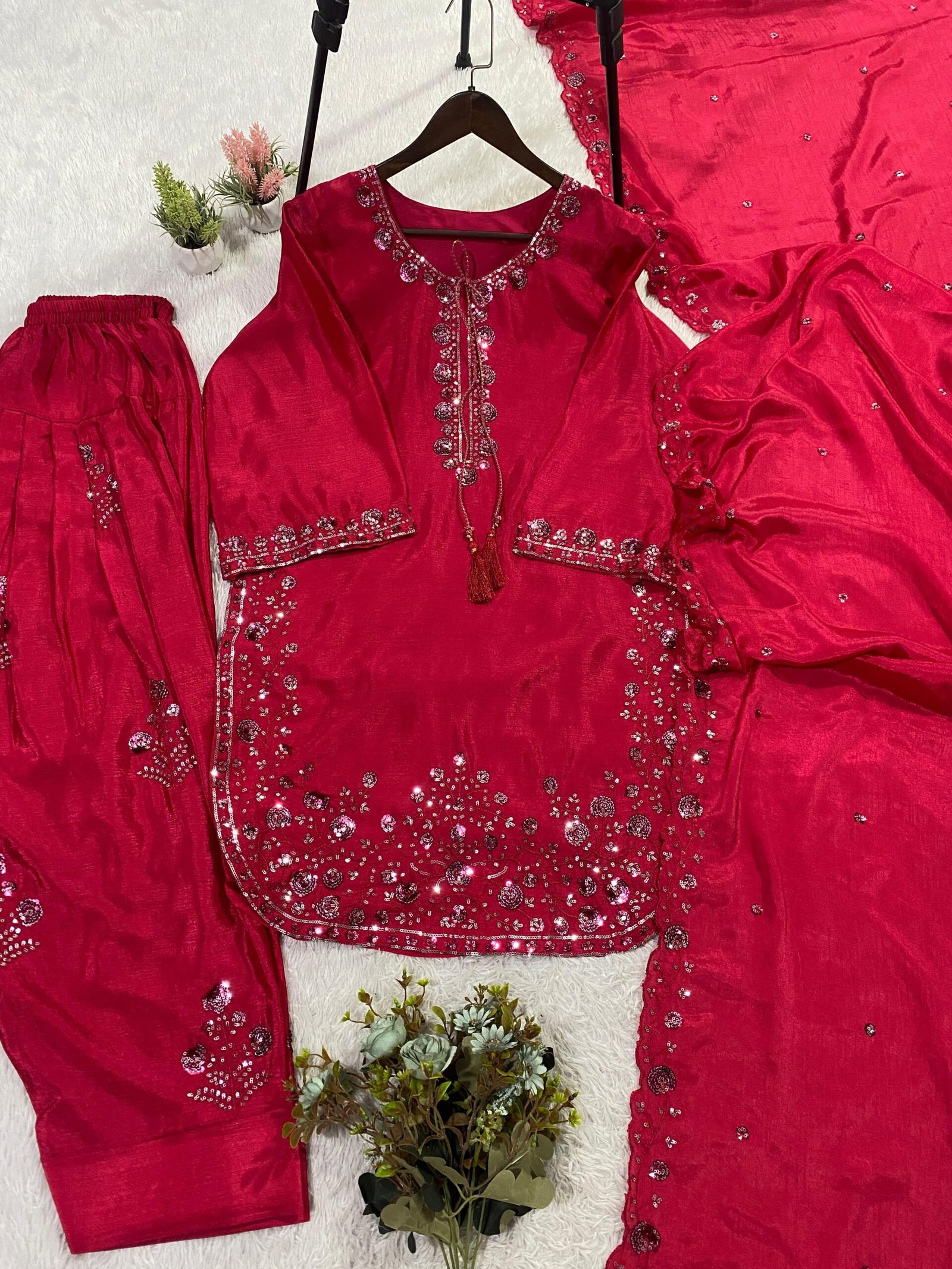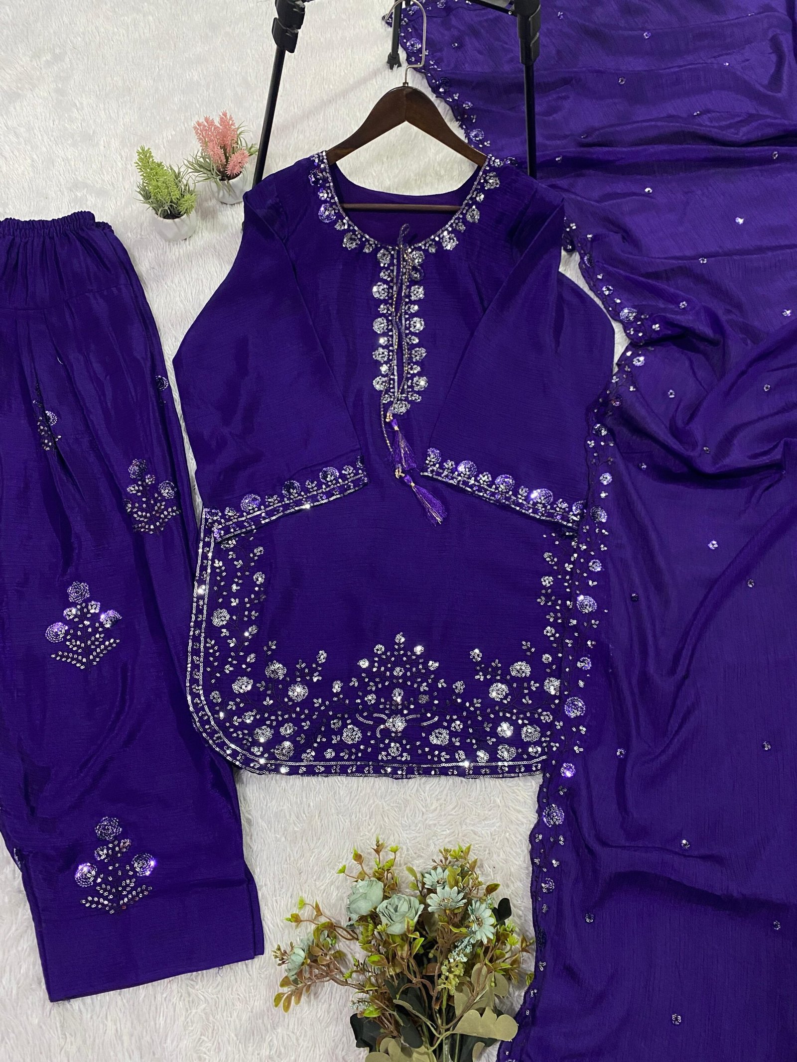 THIS WEDDING SEASON WEAR OUR THREE PIECE OUTFIT WITH SEQUENCE EMBROIDERED WORKED TOP, FARSI SALWAAR AND DUPATTA
